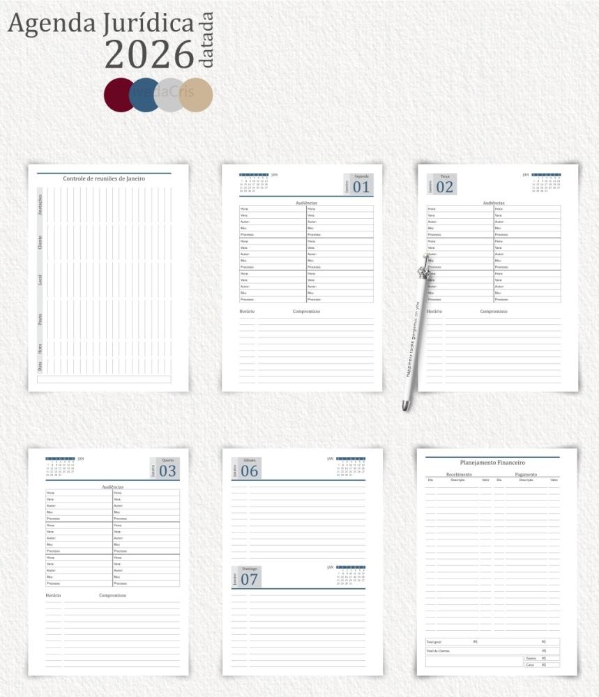 • Visão diária de segunda a sexta com 1 dia por página contendo: 6 espaços para audiências, espaço com pautas para anotações de compromisso e horários