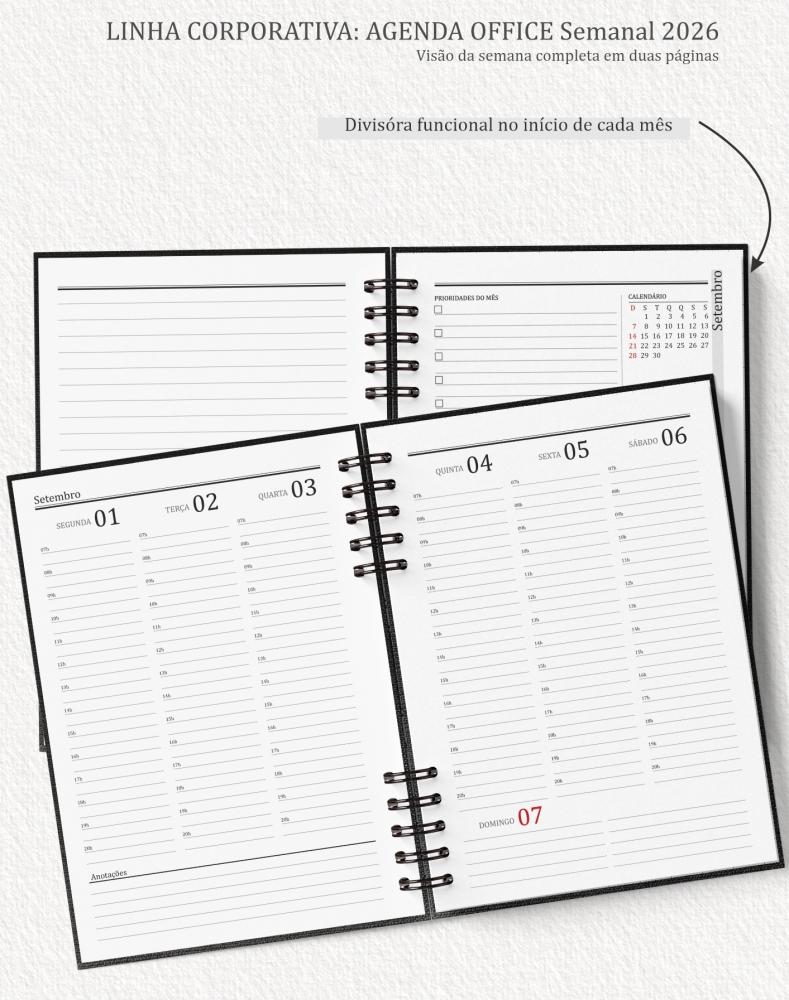 Agenda semanal com visão da semanal em duas páginas com horários para agendamentos das 7h às 20h (ou sem horários) de segunda a sexta a sábado (versão com e sem horários).